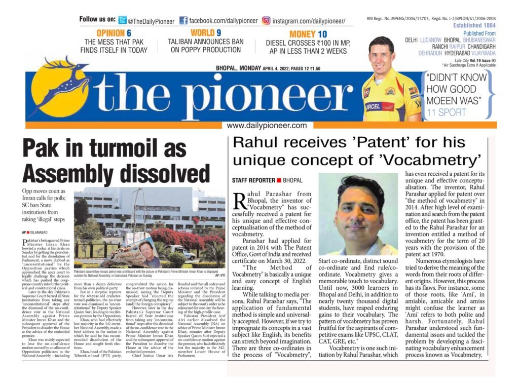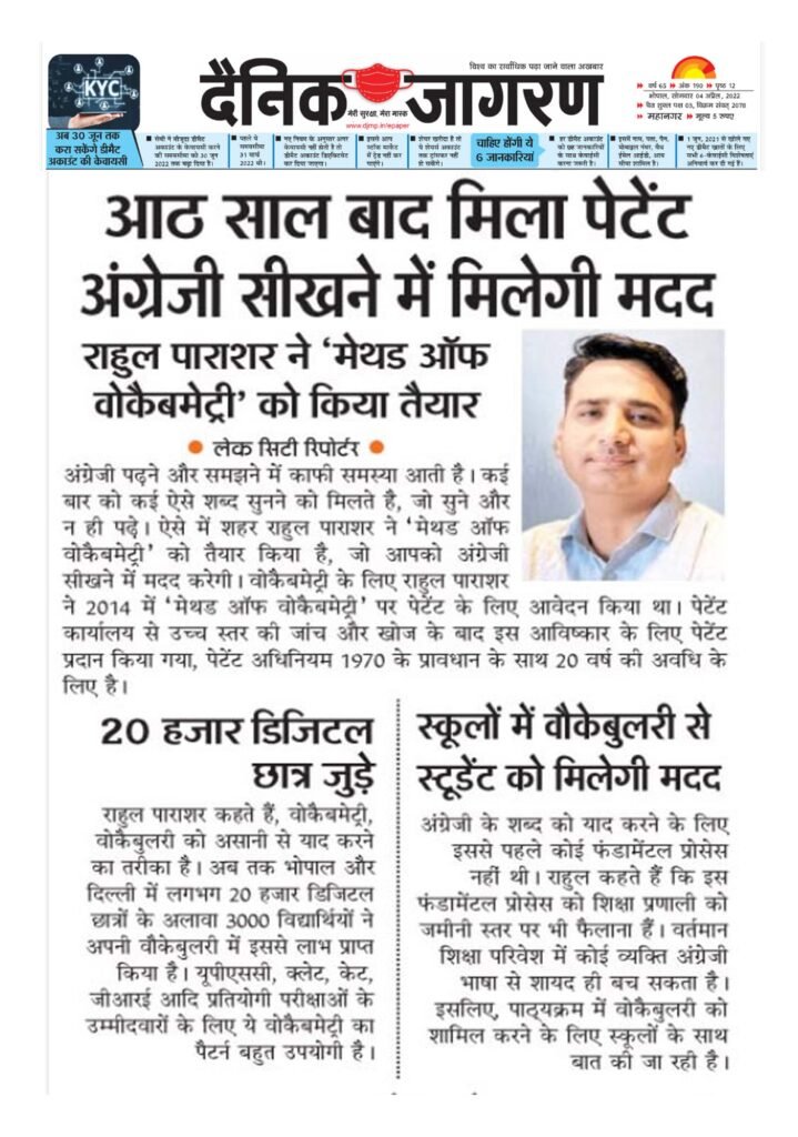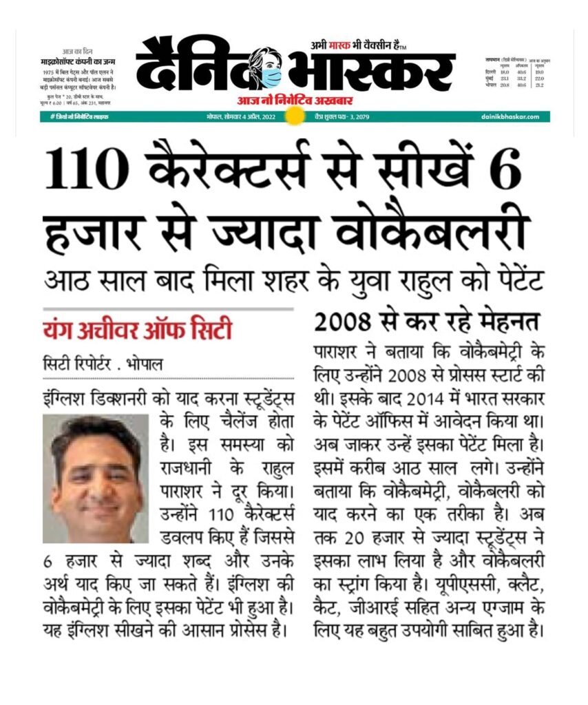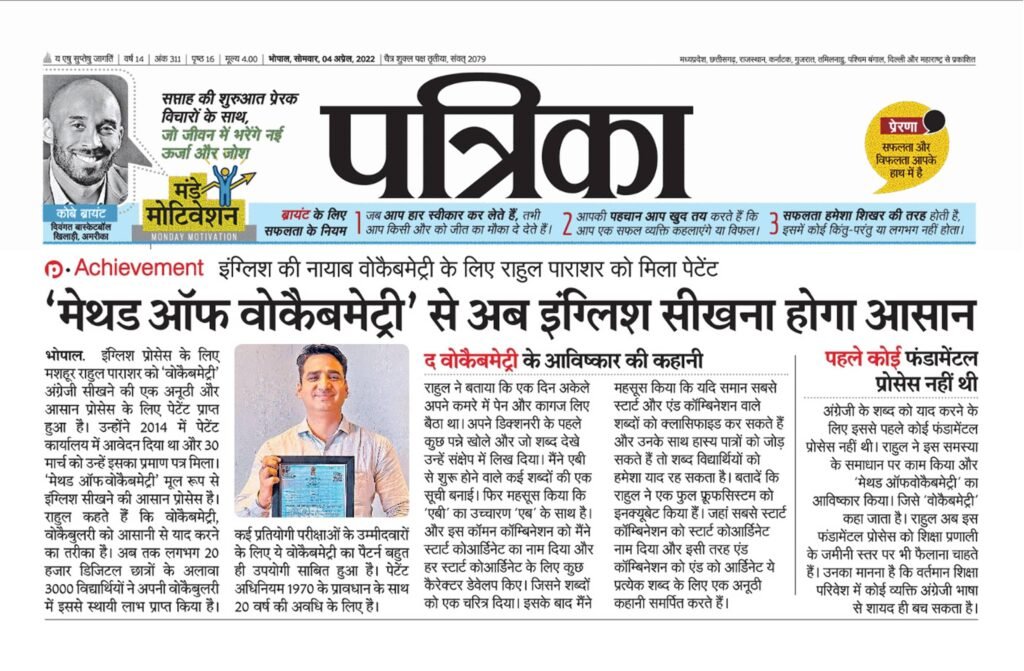 राहुल पराशर ने Vocabmetry तकनीक विकसित की है, जिसे सरकार द्वारा पेटेंट किया गया है। यह तकनीक इंग्लिश सीखने का एक अनोखा और प्रभावी तरीका है, जिससे हज़ारों लोग पहले ही लाभ उठा चुके हैं।
